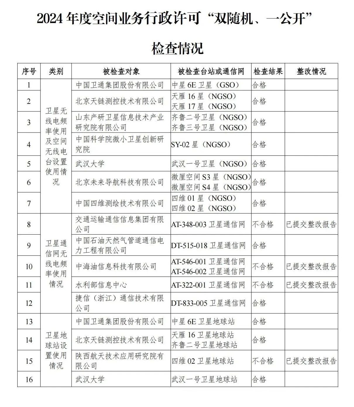 根据国务院“双随机、一公开”监管有关要求,按照《工业和信息化部“双随机、一公开”监管实施办法》《无线电频率使用和在用无线电台(站)监督检查暂行办法》等有关规定,2024年8月至12月,工业和信息化部无线电管理局组织国家无线电监测中心、相关地方无线电管理机构,分别对中国卫通集团股份有限公司等7家单位卫星无线电频率使用及空间无线电台设置使用情况、交通运输通信信息集团有限公司等5家单位卫星通信网无线电频率使用情况、北京天链测控技术有限公司等4家单位卫星地球站设置使用情况进行了“双随机、一公开”检查。