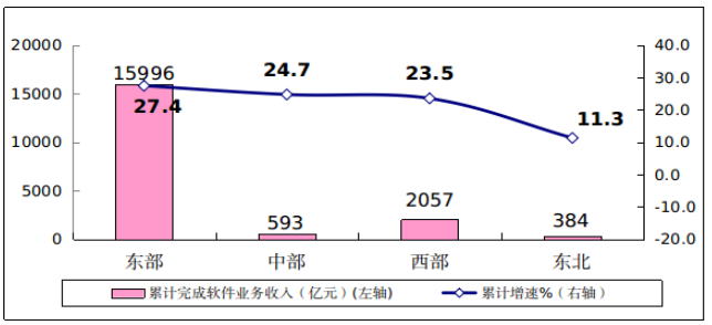中西部地区软件业收入保持快速增长,东部地区增势突出。一季度,东部地区完成软件业务收入15996亿元,同比增长27.4%,比1-2月提高6.1个百分点,高出全国平均水平0.9个百分点。中部地区完成软件业务收入593亿元,同比增长24.7%,比1-2月下降5.7个百分点。西部地区完成软件业务收入2057亿元,同比增长23.5%,比1-2月提高2个百分点。东北地区完成软件业务收入384亿元,同比增长11.3%,比1-2月提高3个百分点。四个地区软件业务收入在全国总收入中的占比分别为84.1%、3.1%、10.8%和2.0%。