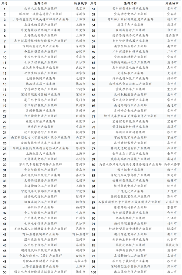 从区域特征来看,百强集群高度集聚东部,江苏、浙江、广东三省占比45%。从产业特征来看,高端装备、新能源汽车、集成电路、生物医药、动力电池为主的高端制造业占比近70%;百强集群产业链覆盖度达88%以上,生物医药、动力电池、新能源、纺织服装等重点行业产业链覆盖度超92%。从创新特征来看,90%的产业集群参与了国家(全国)重点实验室以及国家工程研究中心建设;累计授权专利48.7万件,新能源汽车、装备工业、集成电路、新型显示、生物医药等五大产业集群专利授权量占比近五成,位居产业集群前列。从股权融资来看,集群平均融资金额超百亿元,新能源汽车、生物医药、机器人、集成电路、智能传感器等领域民营企业融资活跃。