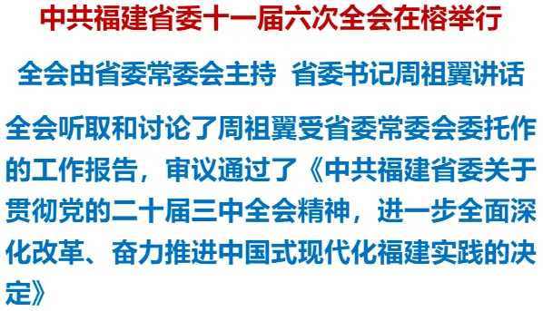 全会号召,全省上下要更加紧密地团结在以习近平同志为核心的党中央周围,坚定不移高举改革开放旗帜,解放思想、守正创新,敢为人先、爱拼会赢,共同写好进一步全面深化改革这篇“大文章”,共同答好推进中国式现代化福建实践这个“新答卷”,奋力把“机制活、产业优、百姓富、生态美”新福建宏伟蓝图变为美好现实,为以中国式现代化全面推进强国建设、民族复兴伟业作出福建新的更大贡献!