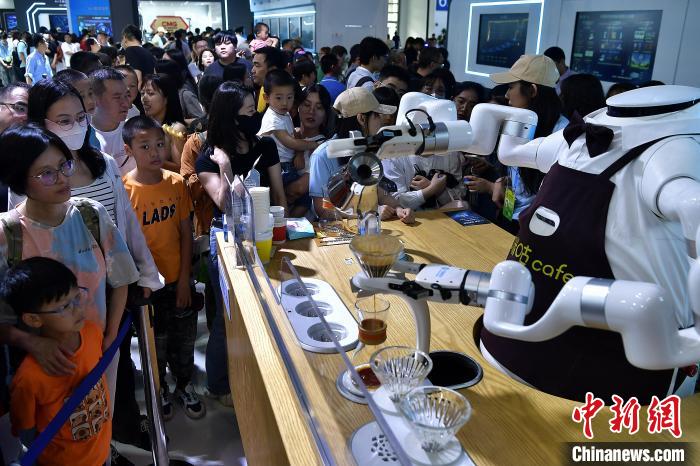 5月25日,“AI咖大师”在展馆内现场冲泡咖啡。在福州举办的第七届数字中国建设峰会现场展示区,各种机器人在各自“岗位”上忙碌。
