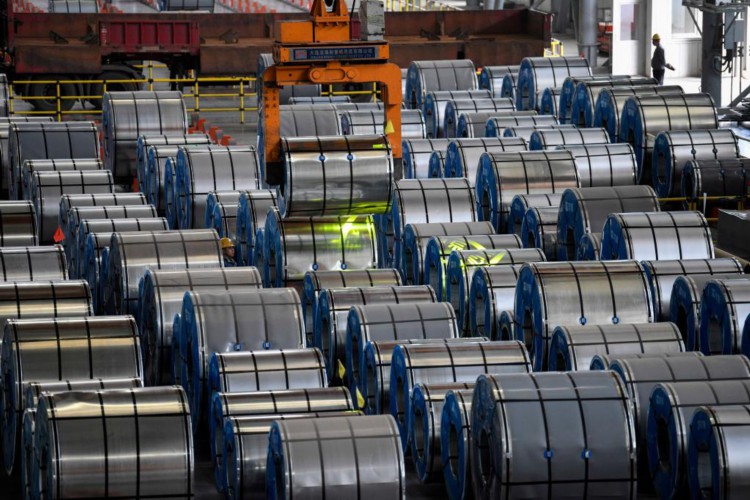 4月19日,在河北双滦一家钒钛新材料企业冷轧产品车间,工人在吊装冷轧镀锌板。