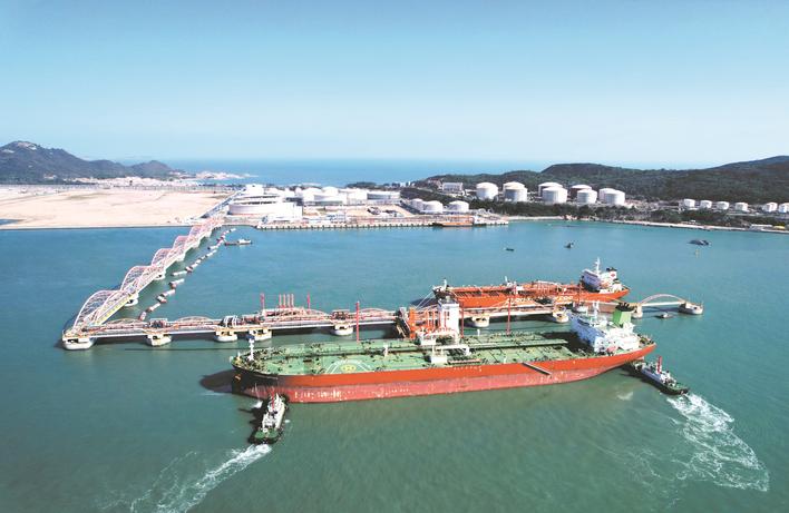 在厦门港古雷石化园区海腾码头,两艘大马力拖轮正顶推协助外轮进港进行原料卸货。