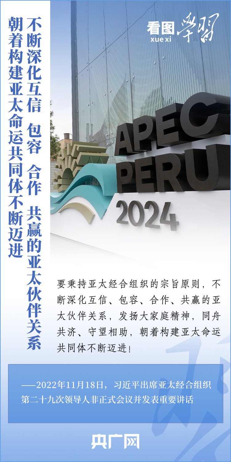 亚太经合组织(APEC)是亚太地区层级最高、领域最广、最具影响力的经济合作机制。11月13日至17日,习近平主席赴利马出席亚太经合组织第三十一次领导人非正式会议并对秘鲁进行国事访问。从“亚太梦想”到“APEC方式”,从“亚太伙伴关系”到“亚太命运共同体”……2013年以来,习近平主席出席或主持历次APEC领导人非正式会议,就全球及地区形势、亚太区域合作、APEC未来发展等一系列重大问题阐释中国主张,推动不断深化互信、包容、合作、共赢的亚太伙伴关系,建设开放、活力、强韧、和平的亚太共同体。一起来学习!