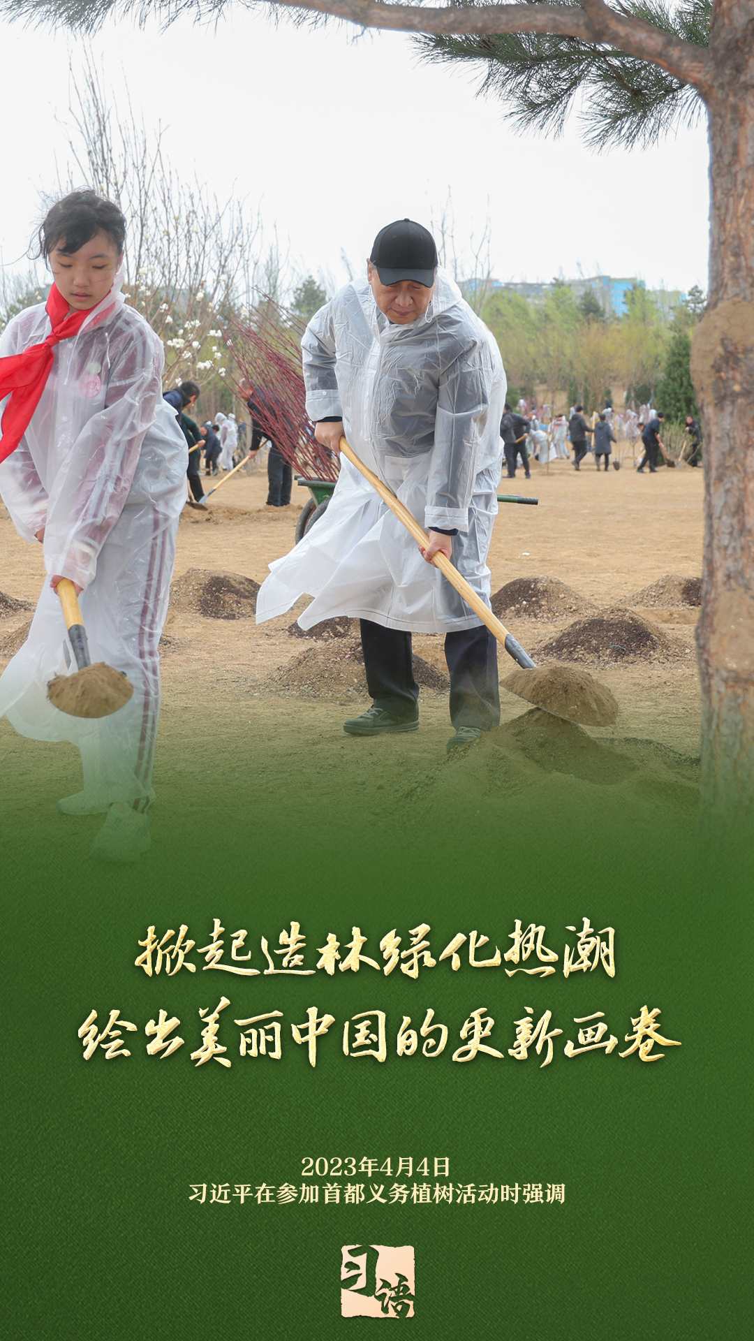 “植树造林是一件很有意义的事情,是一项功在当代、利在千秋的崇高事业,要一以贯之、持续做下去。”自2013年以来的13个春天里,无论晴雨,习近平总书记都会拿起铁锹,与干部群众一起参加首都义务植树活动。铲土造坑、培土围堰、提水浇灌,总书记身体力行种下绿色的希望,对扩绿兴绿护绿、建设美丽中国提出明确要求。一起学习。
